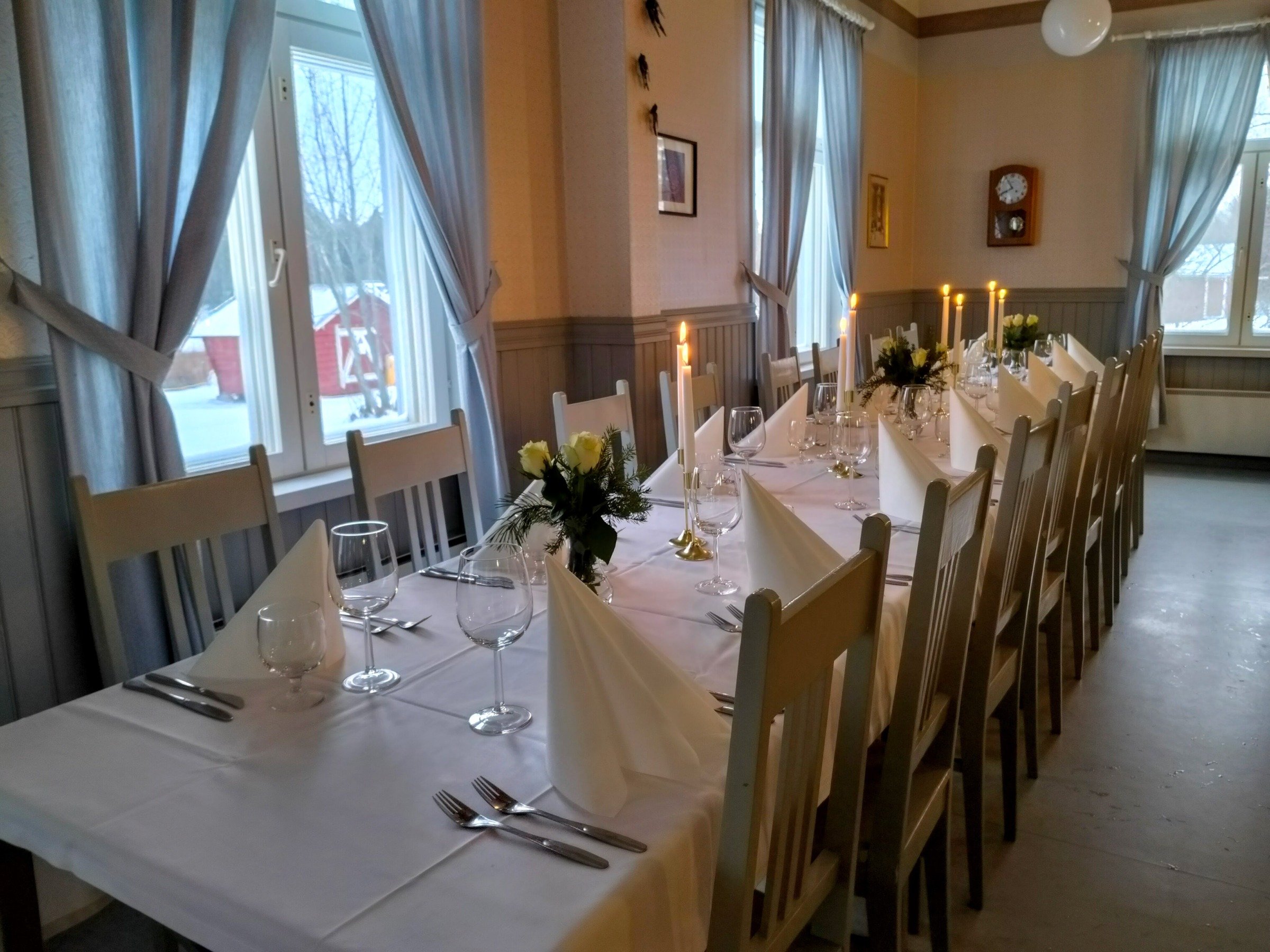 Tarjolla on perinteinen ja tunnelmallinen suomalainen miljöö, jossa juhlit rauhassa- Voimme järjestää tilaisuuden teille kokonaisuudessaan sisältäen juhlatilan, kattauksen, ruoan ja juoman, kahvituksen, tarjoilun, kukat ja siivouksen. Näin ollen teidän ei tarvitse huolehtia tilaisuuden järjestelyistä, me teemme sen puolestanne. Voitte myös vain tehdä tilavuokrauksen ja järjestää juhlat meillä itse.